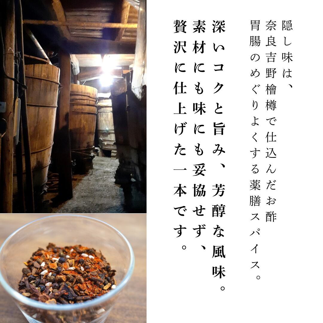 吉野檜樽のお酢、胃腸の巡りを整える薬膳スパイスを合わせました。